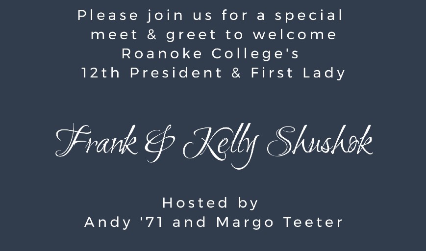 Please join us for a special meet & greet to welcome Roanoke College's 12th President & First Lady Frank & Rev. Kelly Shushok.
