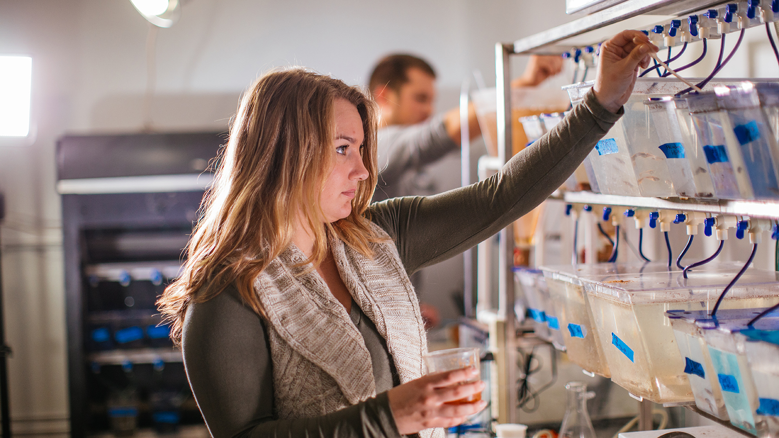 While at Roanoke, biology major and Rhodes Scholar finalist Rebecca Hudon ’17 worked as a research assistant with Biology Professor Chris Lassiter on a genome editing tool to create mutant lines of zebrafish.