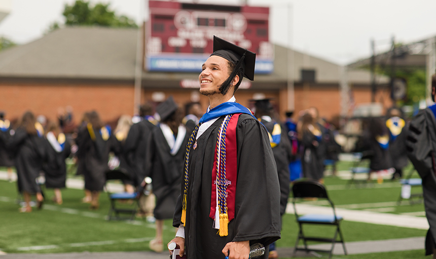 After a delay of more than a year, the Roanoke College Class of 2020 walked across the commencement stage on Saturday, May 22. With their senior year disrupted by the COVID-19 pandemic, their commencement ceremony was postponed. Roanoke College conferred degrees in a virtual ceremony on their original graduation date, May 2, 2020. On Saturday in the Salem Stadium, the Class of 2020 returned to Salem for their in-person commencement ceremony.