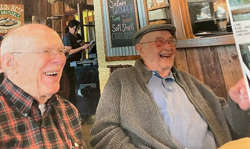 Reid Warren ’56 and Jay Whitcomb ’57 celebrated Warren’s 90th birthday on April 5, 2024, at Woodies Crab House in Maryland. The two met at Roanoke College in the 1950s, when they were roommates, and they have been good friends ever since.