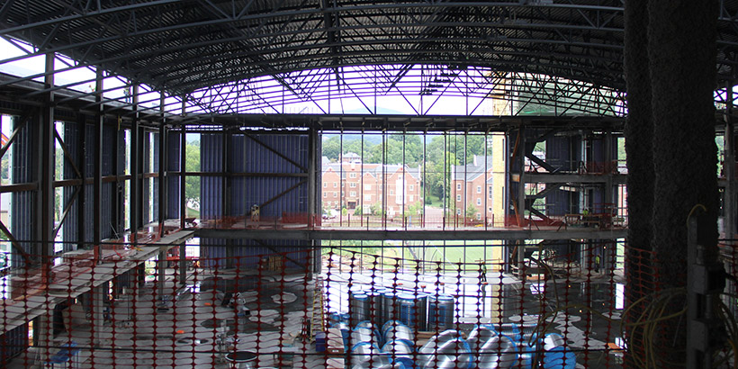 Here's a unique view of the gymnasium from a top level area of the Cregger Center, called the President's Box. The President's Box, which will be enclosed in glass, will house special events and classes.