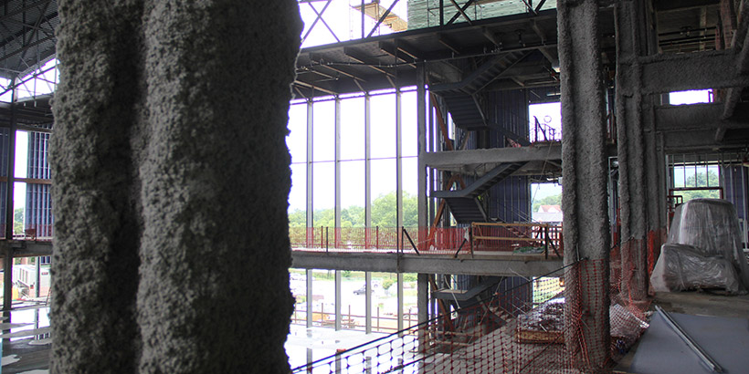 Crews are crafting the front entranceway to the Cregger Center from High Street.