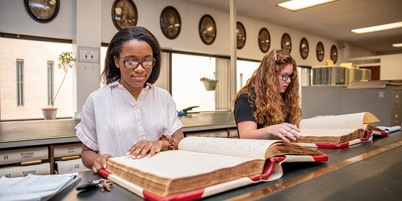 Sydney Pennix and Reece Owen look through records at the Roanoke County Records Room.