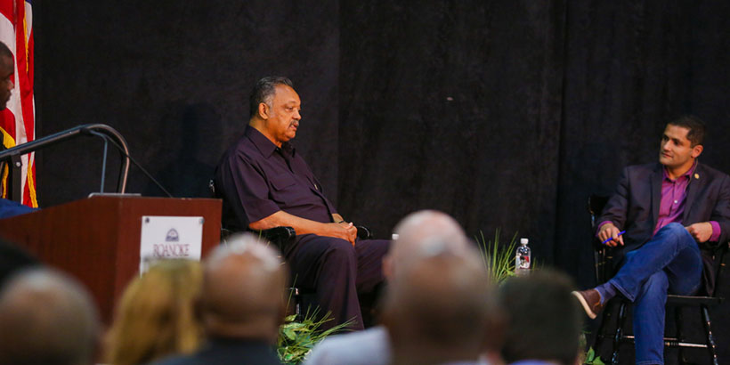 The Baptist minister, civil rights leader and one-time candidate for the U.S. presidency, was accompanied by Virginia Del. Sam Rasoul, a member of the Virginia House of Delegates and a 2002 graduate of Roanoke. The event was presented by the Roanoke College Democrats.