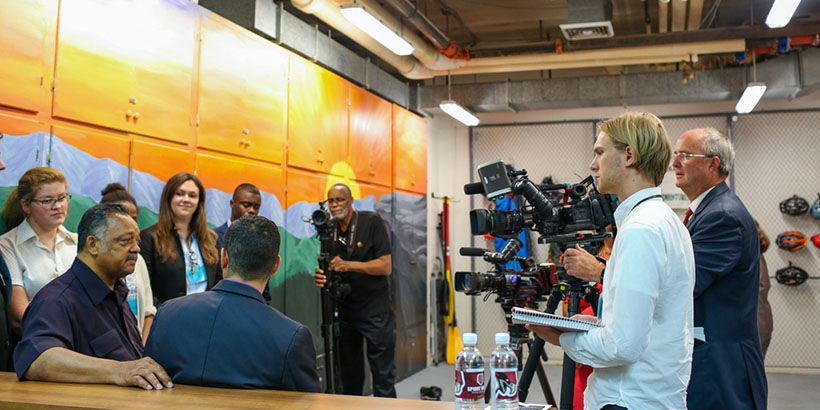 A behind the scenes look of camera crew interviewing Sam Rasoul and Jesse Jackson.