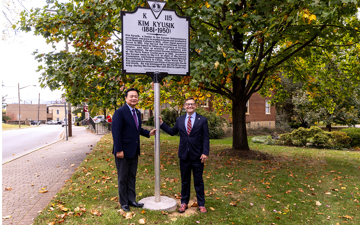 Ambassador Cho and President Shushok stand at the Kim Kyusik Virginia historical marker.