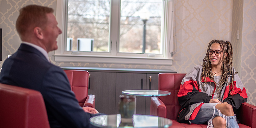 Below: Roanoke College Director of Strategic Partnerships for Student & Alumni Success Jonathan Lee (left) talks with Ashton Howard ’24 inside PLACE.
