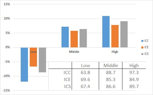 Finally, sentiment varies dramatically across income levels. Low income households (<$20,000) are significantly more pessimistic about their finances and the economy, both today and into the future. The VAICC fell by 12 percent for this group since May suggesting that these households are feeling the brunt of the struggling labor market. Middle ($25,000-$75,000) and high (>$75,000) income households are considerably more favorable about the economy, particularly the current conditions. It is likely that these groups are the ones receiving the benefits of a strong stock market and rising housing prices. Figure 4 shows the sentiment measures (table) and the percent changes in those measures since May (bars).Figure 4. Consumer Sentiment Measures by Income Level
