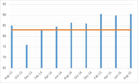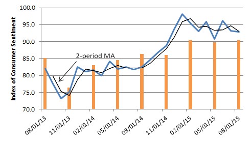 U.S. data downloaded from FRED 8/23/2015; blue line is U.S.Consumer Sentiment; black line is a two year moving average; orange bars are VA Consumer Sentiment
