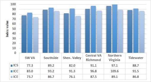 In all regions, sentiments are strong and higher for current conditions than expectations of the coming year. The three index values are shown by region in Figure 4. Central Virginia, Northern Virginia, and the Tidewater, the most populated regions, report the strongest sentiments. Southwest Virginia remains positive about the current conditions despite continued closing announcements by local employers.