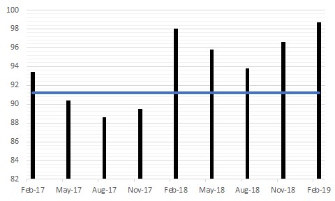 Figure 3 shows the five-year historical values for the VAICS and its two sub-indexes, the Index of Current Conditions (VAICC) and the Index of Consumer Expectations (VAICE). All values increased from last quarter, the VAICE particularly so. The increase stems primarily from optimism about the overall economy and increased incomes compared to a year ago. Over 43% anticipate the next five years to be a period of strong economic growth and prosperity and 42% believe their household finances will improve over the next year. Over 64% believe that now is a good time to buy large durable items due to both rising income and strong deals found in stores or online, continuing the holiday sentiment at the end of 2018.