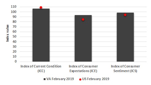 Figure 2. February 2019 Virginia and U.S. Indexes of Current Conditions, Consumer Expectations, and Consumer Sentiment (left to right)