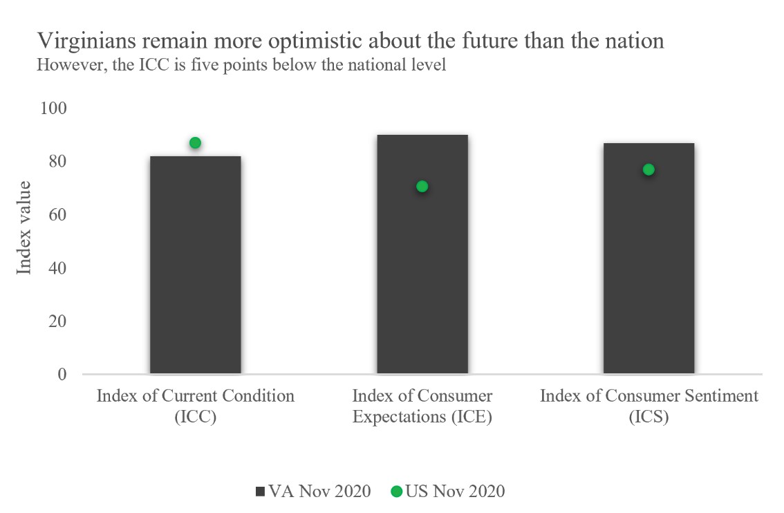 Economic activity continues to resume across many industries, leading employers to hire workers in leisure and hospitality, professional and business services, retail trade and construction, driving the national unemployment down to 6.9% in October. The unemployment rate in Virginia is 6.0%. Nearly 80% of Virginians believe that business conditions are worse today than a year ago, but over half believe things will improve over the next year.