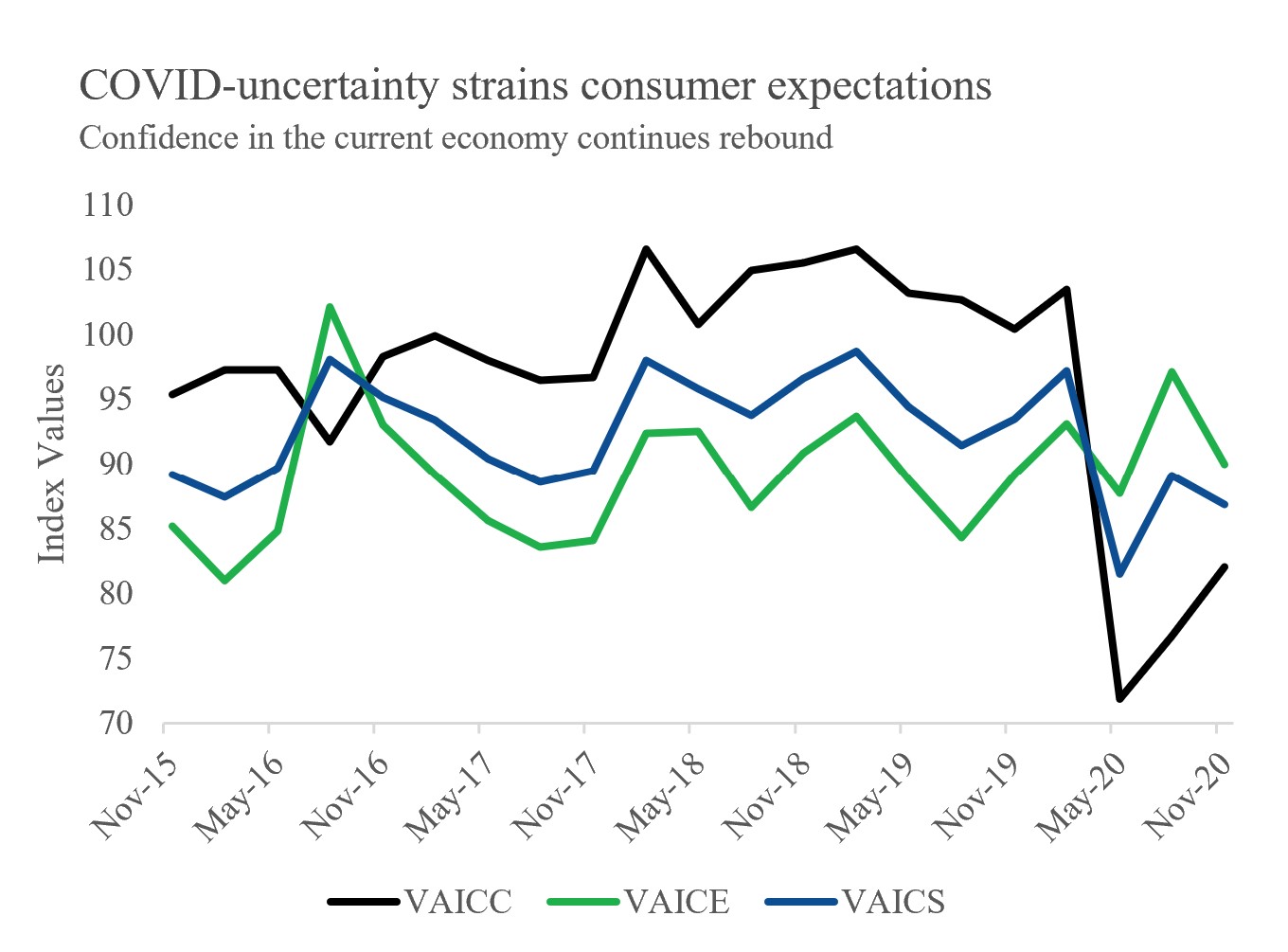 “Consumer sentiment in the Commonwealth retreated from the gains in the third quarter due to concerns about the virus and the related economic uncertainty,” Dr. Alice Kassens, senior analyst for the Roanoke College Institute for Policy and Opinion Research, said. “Economic activity continues to increase as seen in the drastically falling unemployment rate, possibly due to the strong economic fundamentals in place prior to the COVID-driven recession. The recent increase in positive cases, hospitalizations and resulting government restrictions has Virginians on edge and concerned about the future. These worries are reflected in the retreating consumer sentiment value.”